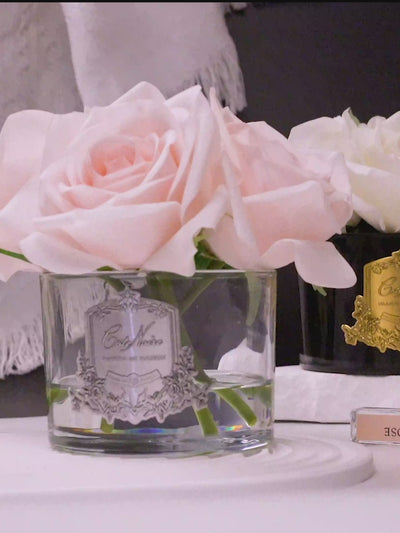 الزهور مرتبة داخل وعاء كريستال فاخر، وفي أسفل الوعاء يوجد جيل خاص يحاكي شكل الماء ويثبّت ترتيب الزهور بشكل أنيق دون أن تتحرك.